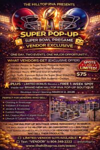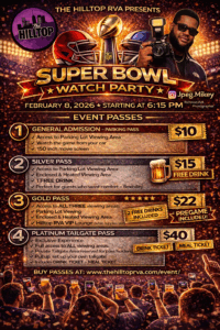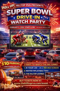 Get ready for the ultimate Super Bowl experience at The Hilltop RVA! Whether youβre pulling up with your crew, watching from your car, or posted up in our VIP lounge, weβve created multiple ways for you to enjoy the biggest game of the year β your way.